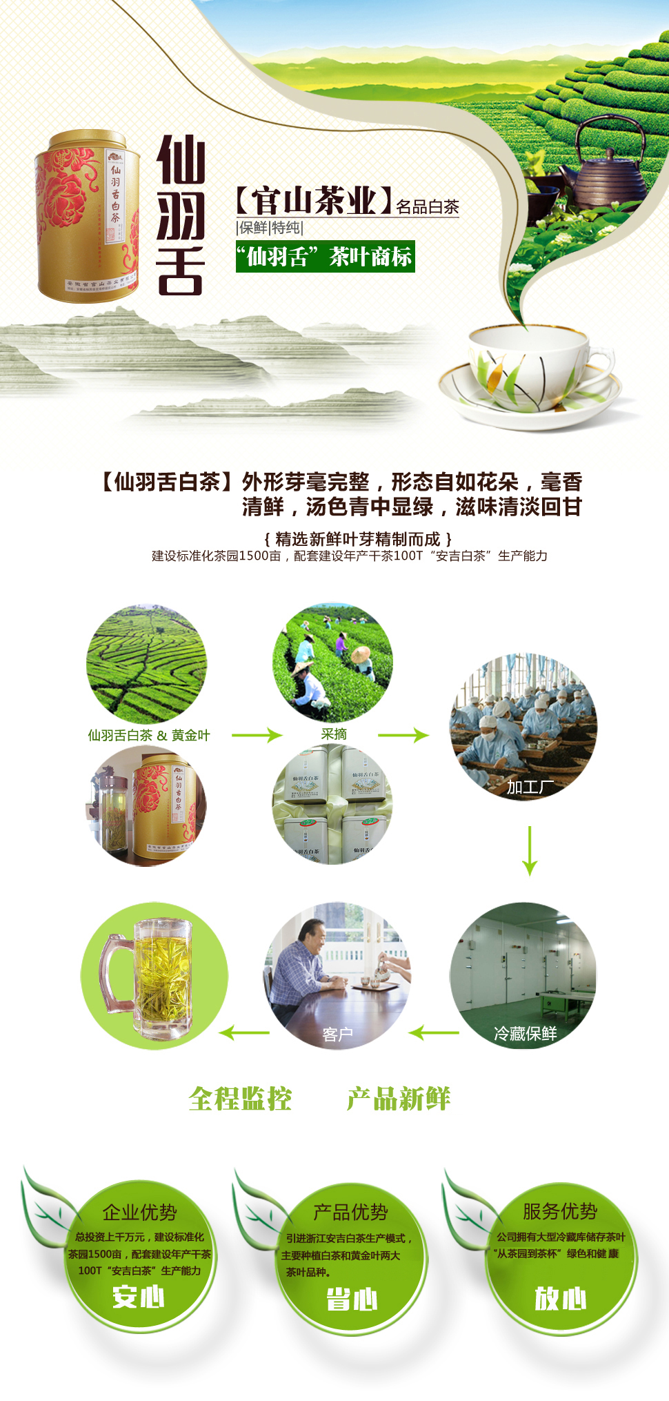 安徽省官山生態(tài)農(nóng)業(yè)發(fā)展有限公司成立于2013年5月,位于銅陵市樅陽(yáng)縣官埠橋鎮(zhèn)。公司開(kāi)發(fā)的“仙羽舌白茶”種植基地位于大別山南麓的官山,平均海拔300多米。這里山巒起伏,泉水奔流,植被茂盛,生物多樣,晝夜溫差大,堪稱(chēng)人間仙境。公司秉承“技術(shù)標(biāo)準(zhǔn)化,產(chǎn)品優(yōu)質(zhì)化,行為規(guī)范化,管理現(xiàn)代化?!钡慕?jīng)營(yíng)理念,茶葉栽培嚴(yán)格按照“一控兩減三基本”的標(biāo)準(zhǔn)要求,以農(nóng)家肥、綠肥、餅肥等肥料代替化學(xué)肥料;以農(nóng)業(yè)、物理和生物方法代替化學(xué)農(nóng)藥防治病蟲(chóng)害,相應(yīng)制訂了《綠色茶葉種植技術(shù)規(guī)程》、《綠色茶葉加工技術(shù)規(guī)程》、《綠色茶葉質(zhì)量控制規(guī)范》等各項(xiàng)技術(shù)管理規(guī)程,形成了質(zhì)量管理和技術(shù)管理體系?!跋捎鹕喟撞琛币浴吧⑾?、...