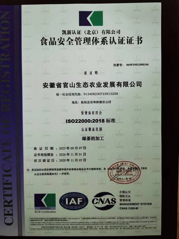 食品安全管理體系認(rèn)證證書